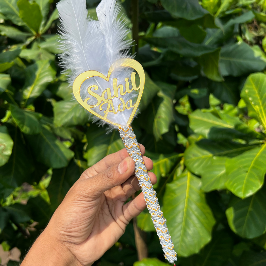 This beautiful pen features a full white feather attached at the back, giving it a royal and graceful look. The pen is wrapped with premium ribbon, and inside it comes with a smooth blue ball pen for actual signing. On top, a golden acrylic name plate is added with the couple’s names, making it completely personalised.